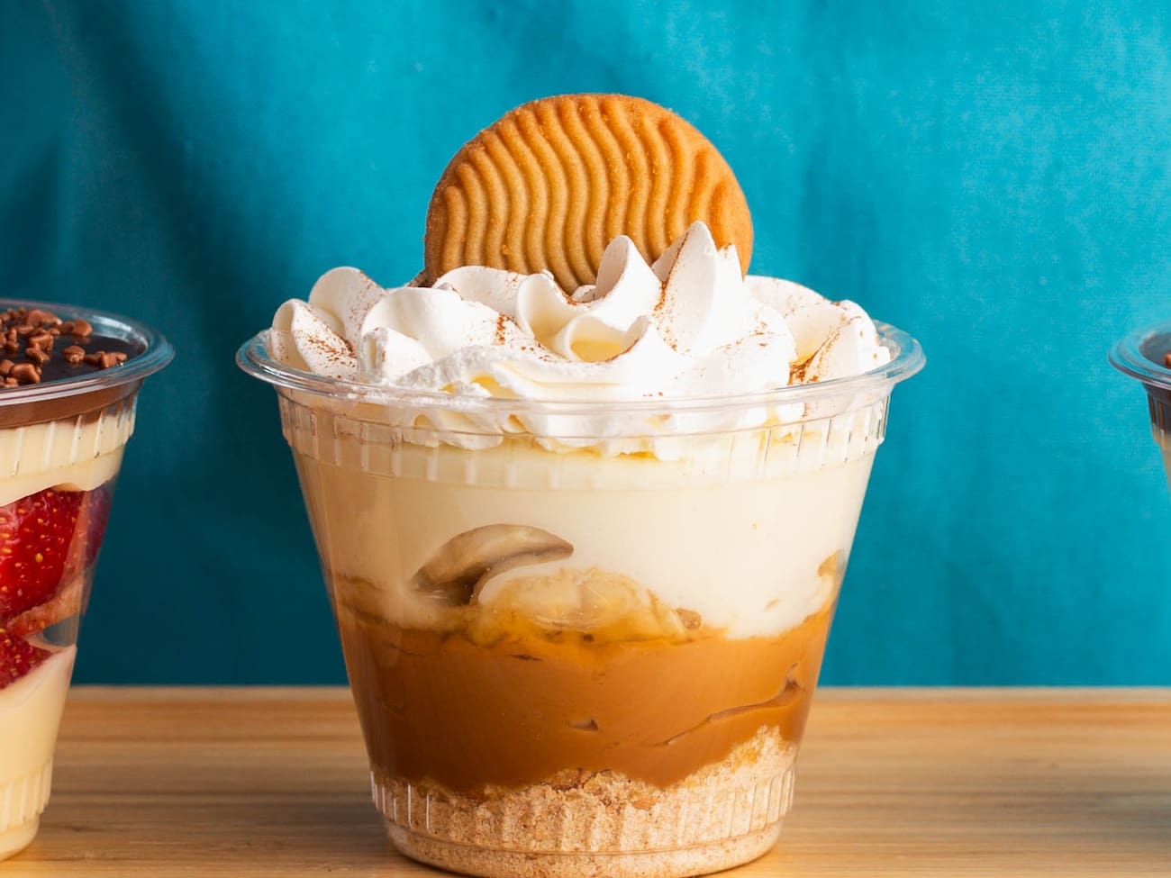 Sobremesa no pote de banana caramelizada, doce de leite, farofinha especial, chantily e um leve toque de canela