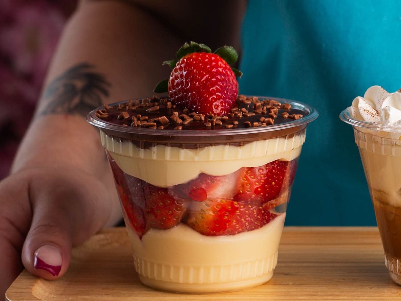 Sobremesa no pote com creme especial da casa, morangos finalizado com chocolate.