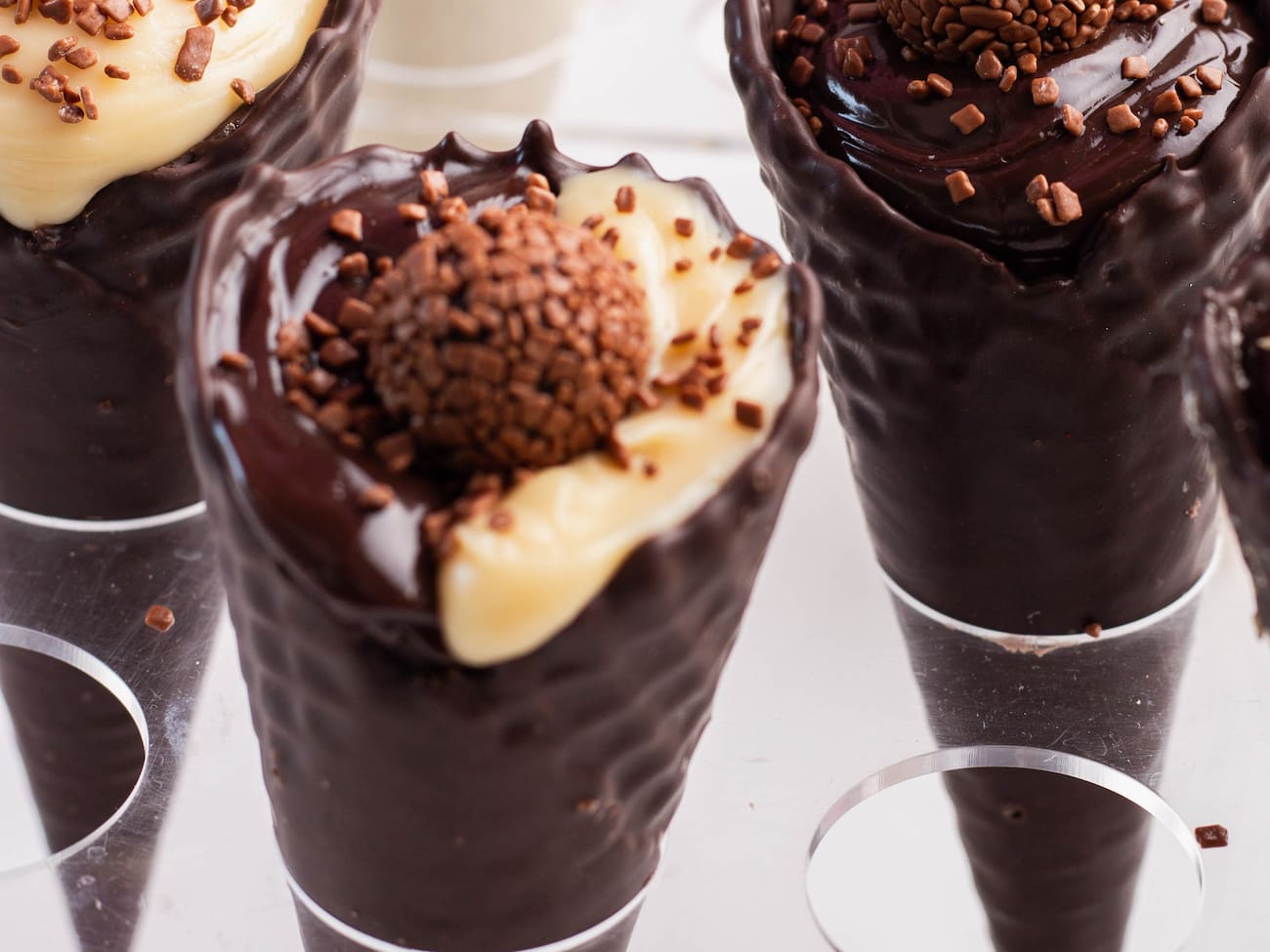 Mega cone com casquinha crocante, banhada com chocolate, recheada com brigadeiro gourmet cremoso.