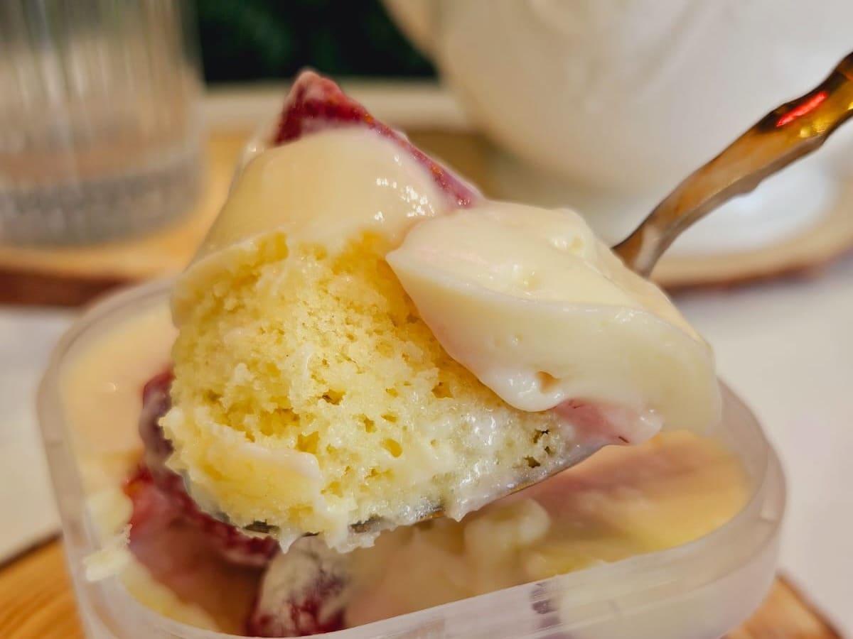 Bolo de pote com massa fofinha e molhadinha com recheio de Ninho cremoso e morangos frescos.
