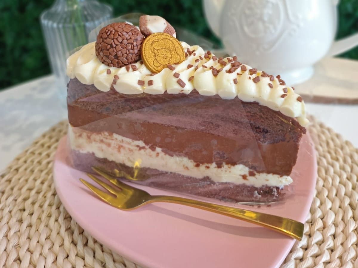 Delicioso bolo com massa de cacau black, recheado com mousse de chocolate meio amargo, coberto com brigadeiro ao leite, a combinação perfeita e bem chocolatudo.