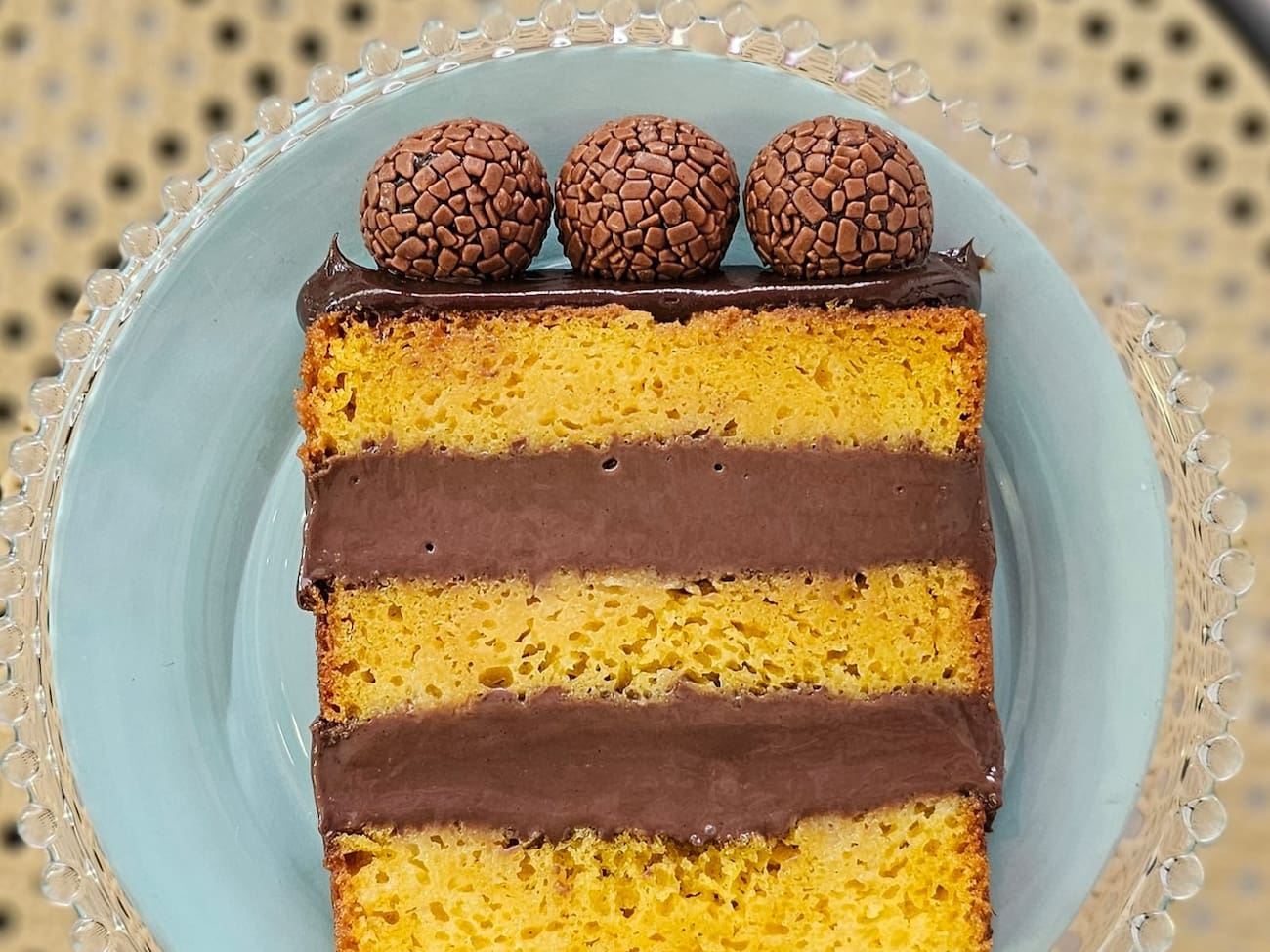 Fatia de bolo de Cenoura com recheio de brigadeiro, acompanhado de 3 brigadeiros ao leite.