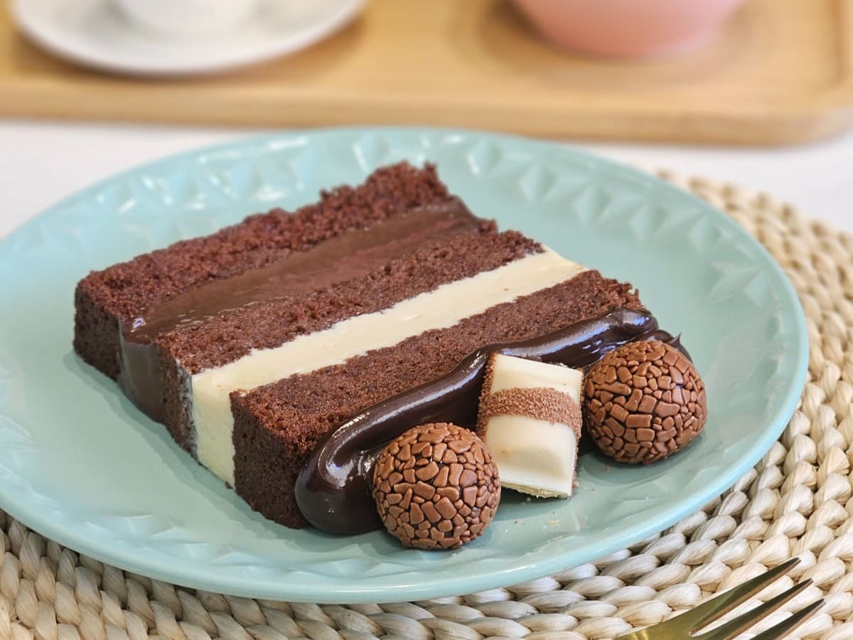 Fatia de bolo com massa de cacau, recheio de brigadeiro de avelã e brigadeiro ao leite, acompanhado de 1 quadradinho Kinder Bueno e 2 brigadeiros ao leite.