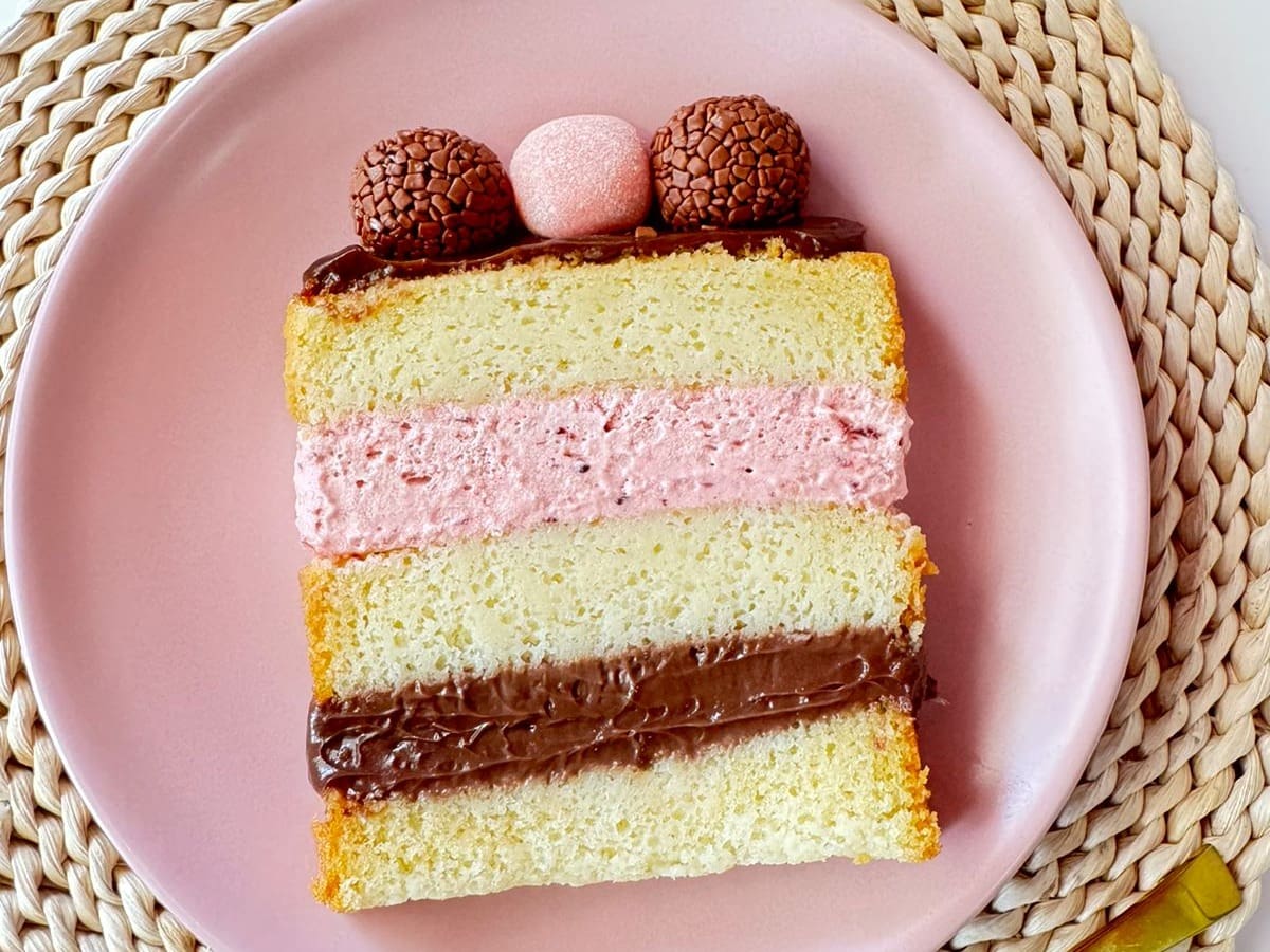 Deliciosa fatia de massa branca com recheio de frutas vermelhas e brigadeiro, acompanhada de 3 docinhos.