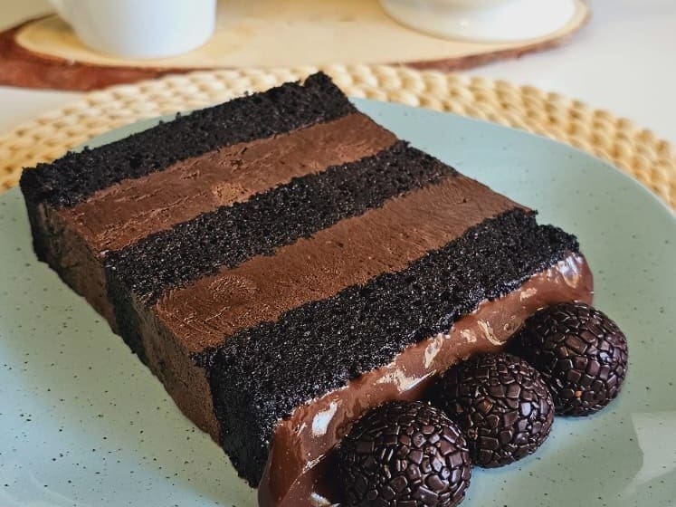 Fatia de bolo com massa de cacau, recheio de brigadeiro de avelã e brigadeiro ao leite, acompanhado de 1 quadradinho Kinder Bueno e 2 brigadeiros ao leite.