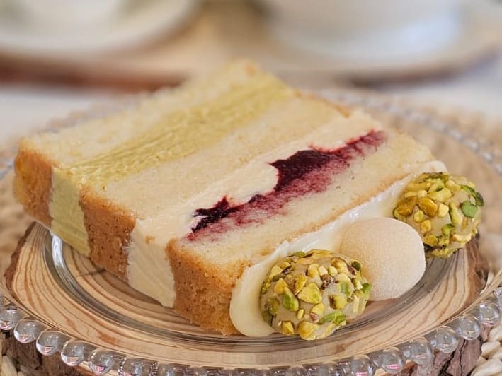 Delicioso bolo de massa branca com recheio de brigadeiro de pistache e frutas vermelhas