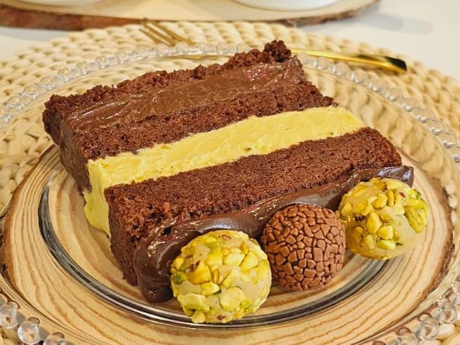 Fatia de bolo massa de cacau , recheio de brigadeiro ao leite e brigadeiro de pistache, acompanhado de 3 docinhos.